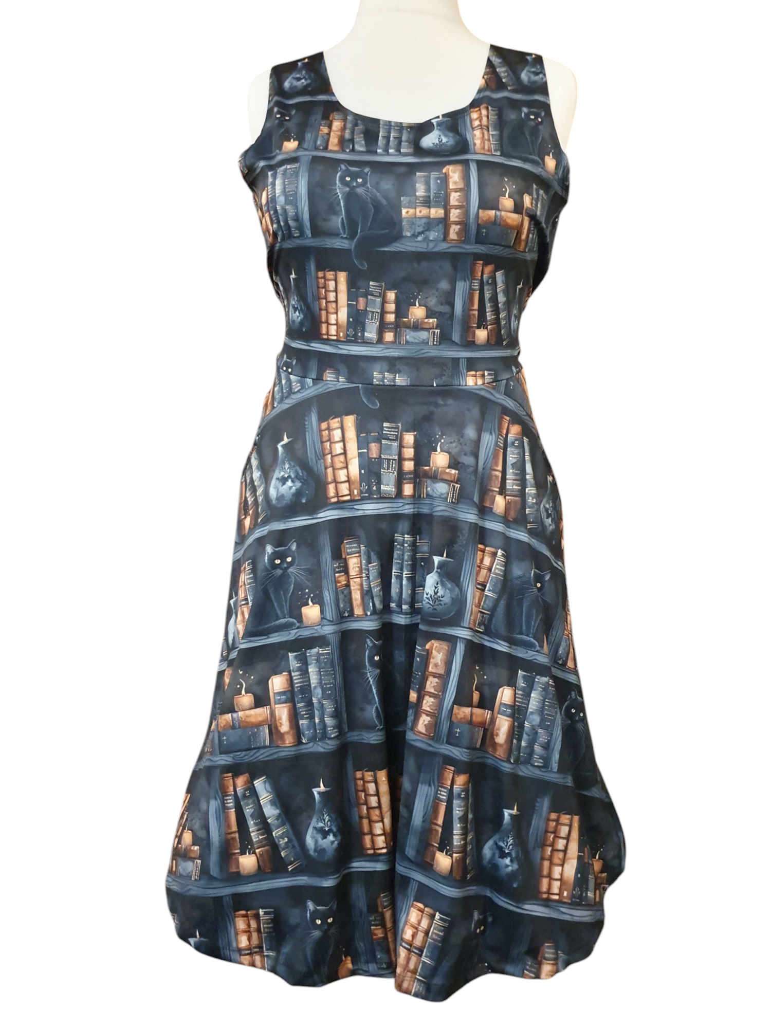 This skater dress falls just below the knee and has pockets. It features a bookcase full of antique books and black cats.